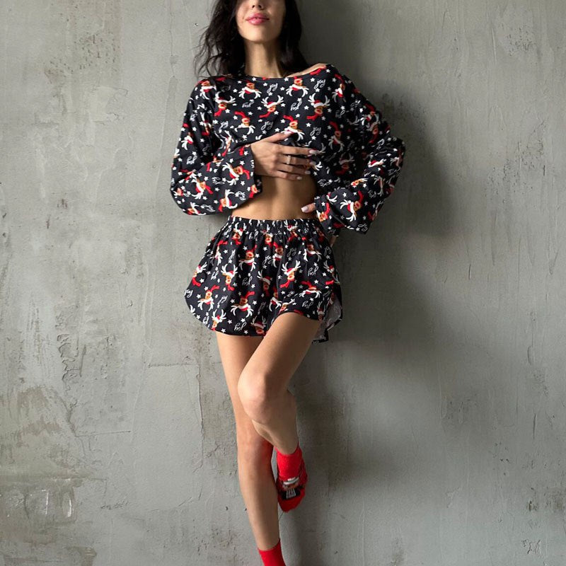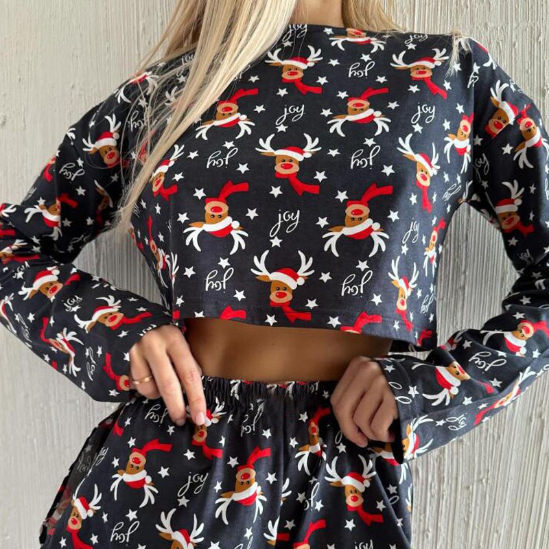 Crafted from soft, breathable fabric, this two-piece set includes a relaxed-fit, long-sleeve crop top and elastic-waist shorts for ultimate comfort and flexibility. Perfect for cozy nights in, holiday mornings, or simply adding some seasonal cheer to your wardrobe.